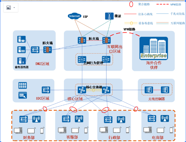 整体采用区域化设计,分别分为互联网出口区域、DMZ业务区域、办公区域、IDC区域等