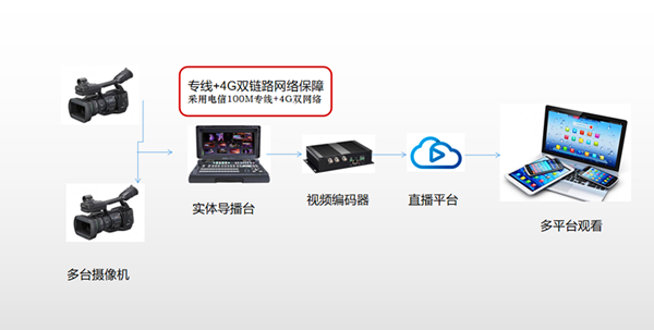 多路摄像机进行现场视频信号采集,通过视频线传给便携式采编录网络直播一体机,一体机将对采集的信号进行切换、编辑,通过专线网络将现场视频信号推送到3044AM永利自有网络直播平台供网络用户观看。在赛事进行中摄像机主机位全景,主要拍摄赛场画面,配合游击机位特写进行切换。游机画面介绍,主要游走会场跟拍进行内容,一般位置不固定,画面以特写为主,是固定特写机位的画面补充。