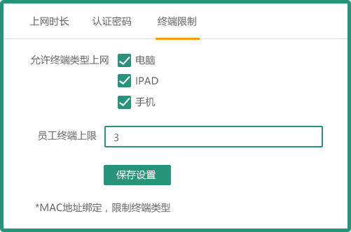 通过部署wifi认证系统之后:管理员可以登陆后台管理平台,在管理终端模块中,设置允许上网的终端类型,以及数量;同时也可以根据员工账号,自由绑定终端的MAC地址。可实现限制非办公设备加入网络。