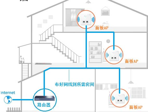 使用面板式AP的方式组网,实现全方位无线覆盖。面板AP方案,是由一个主路由和多个面板AP组合而成,主路由器与面板AP之间通过家里预埋的网线传输信号, 面板AP可直接替换家里原有网络面板,无需重新布线,不破坏原有装修。