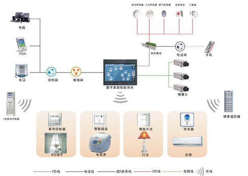 家庭智能网关是系统的核心,采用32位精简指令集计算机ARM处理器,构建嵌入式Linux操作系统平台,通过键盘或触摸屏液晶显示进行状态设置和查询。智能网关与Internet和PSTN相连,可将接收到的控制命令(包括本地遥控器命令、远端电话语音命令、远端手机命令、远端计算机命令等)转换成无线射频信号,并通过射频发送模块发射出去,实现家居智能化控制。