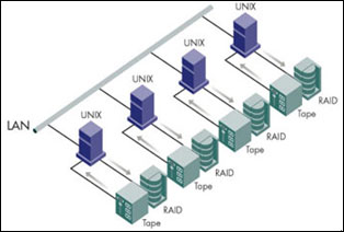 传统备份与恢复模型的主要特征是,每台特定主机服务器都配有专门的磁盘和磁带系统,每台主机都将自己的数据备份到本地连接的自己的磁带机或磁带库上。这种设计对磁带资源的利用率比较低,因为如果某台服务器的磁带机空闲,其它服务器也无法使用它。此外,每个操作系统平台一般都使用专门的备份与恢复应用软件,使整个资源管理工作和备份与恢复过程变得更加复杂化。与现在的企业存储系统相比,磁盘和磁带系统的速度慢、可靠性低、规模更小,因为在必须为每台服务器购买存储资源的情况下,很多机构无法承当购买更快、更可靠的存储资源的费用。
