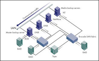 让 LAN 脱离备份与恢复过程,可以带来许多益处。各机构可以实施连接到 SAN 的磁带机和磁带库,这样,每台服务器都可以将其备份数据直接发送到共享磁带资源,而不是通过网络发送到备份服务器。先进备份与恢复应用软件仍然可以对这个过程进行控制,对备份与恢复数据进行跟踪。SAN 实现了从每台服务器向共享的 SAN 存储资源传送大量数据的功能,但是 LAN 仅用于传送服务器之间的元数据通信。这将带来一个更快、可扩展性更高和更可靠的备份与恢复解决方案,对存储、服务器和 LAN 资源的利用率将得到有效提高。