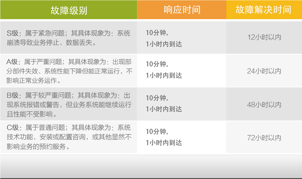 二: 临时上门 出现故障云烁工程师根据故障的等级分类提供不同时间的上门服务,不限次数的