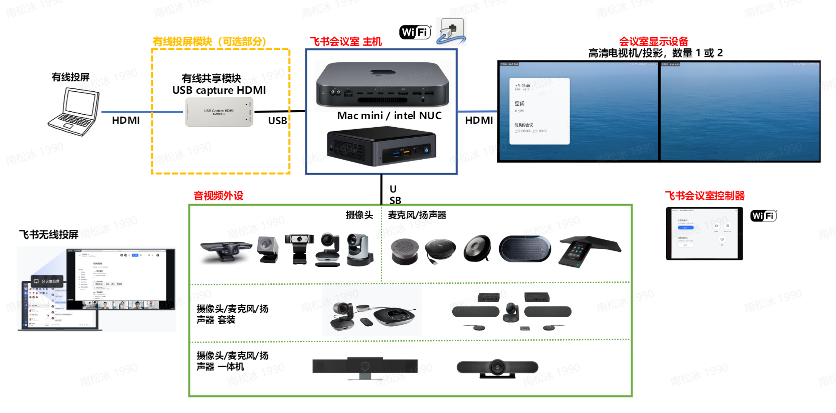 飞书会议室针对软硬件结合的音视频会议以及会议管理的解决方案;飞书提供会议室相关软件,包括音视频软件与会议签到板软件,其中音视频软件包括飞书会议室以及飞书会议室控制