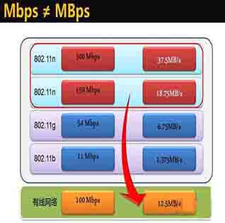 这是目前主流的无线标准及其最大传输速度,主流的100Mbps桌面接入有线网络,换算之后就是后面的数据。