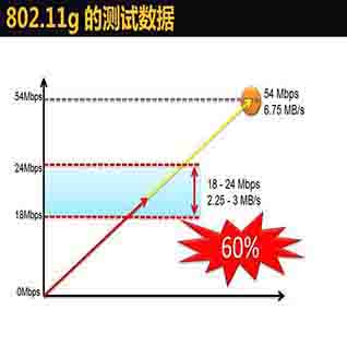 在实际测试过程中,大部分的802.11g网络的传输速度在18-24Mbps之间,即2.25-3MB/s。水份也达到了60%