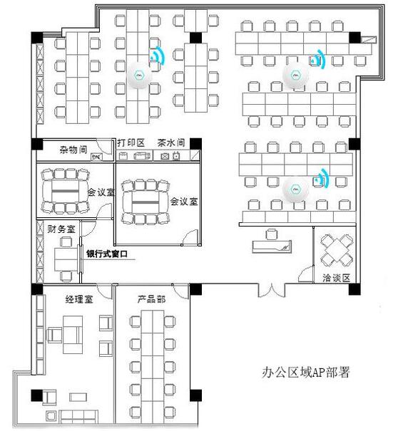 目前大多数企业更倾向于有线网络办公,无线网络主要是对有线网络的补充。一般环境的办公区域阻隔障碍物比较小,企业可根据实际情况将吸顶AP进行均匀分布。