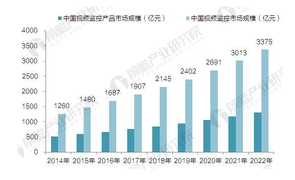 图表显示,预计未来五年行业年均复合增长率约为12%-15%,2021年,中国视频监控市场规模将突破3000亿元,2022年中国视频监控市场规模将达到3300亿元。