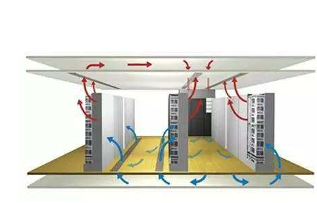 机房机密空调气流组织为下送风上回风方式,通过金属微孔地板弥散式送风方式将冷空气送到机柜的前部。两排机柜背对背的摆放方式,使机柜间形成热通道,提高了空调的制冷效果,节省了能源。