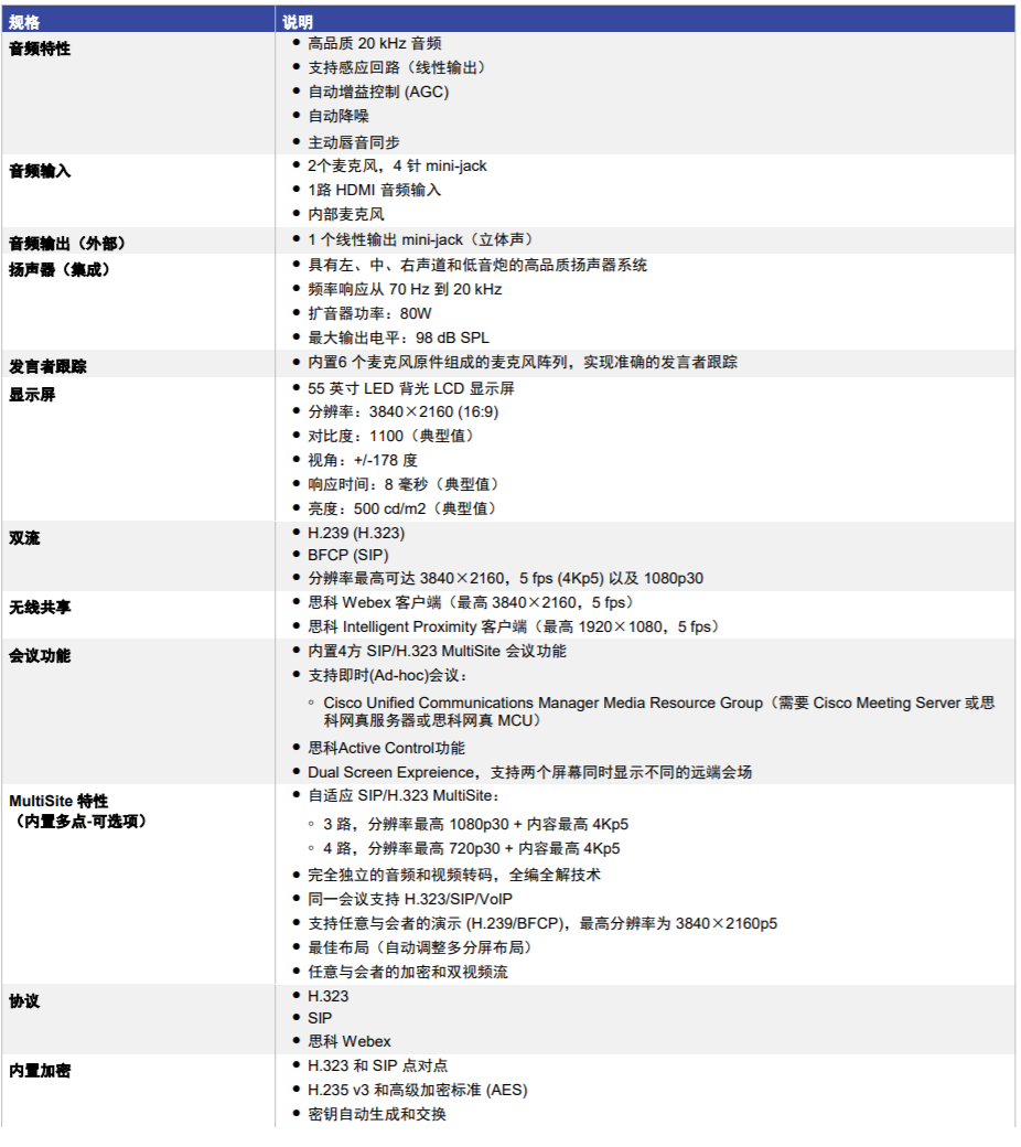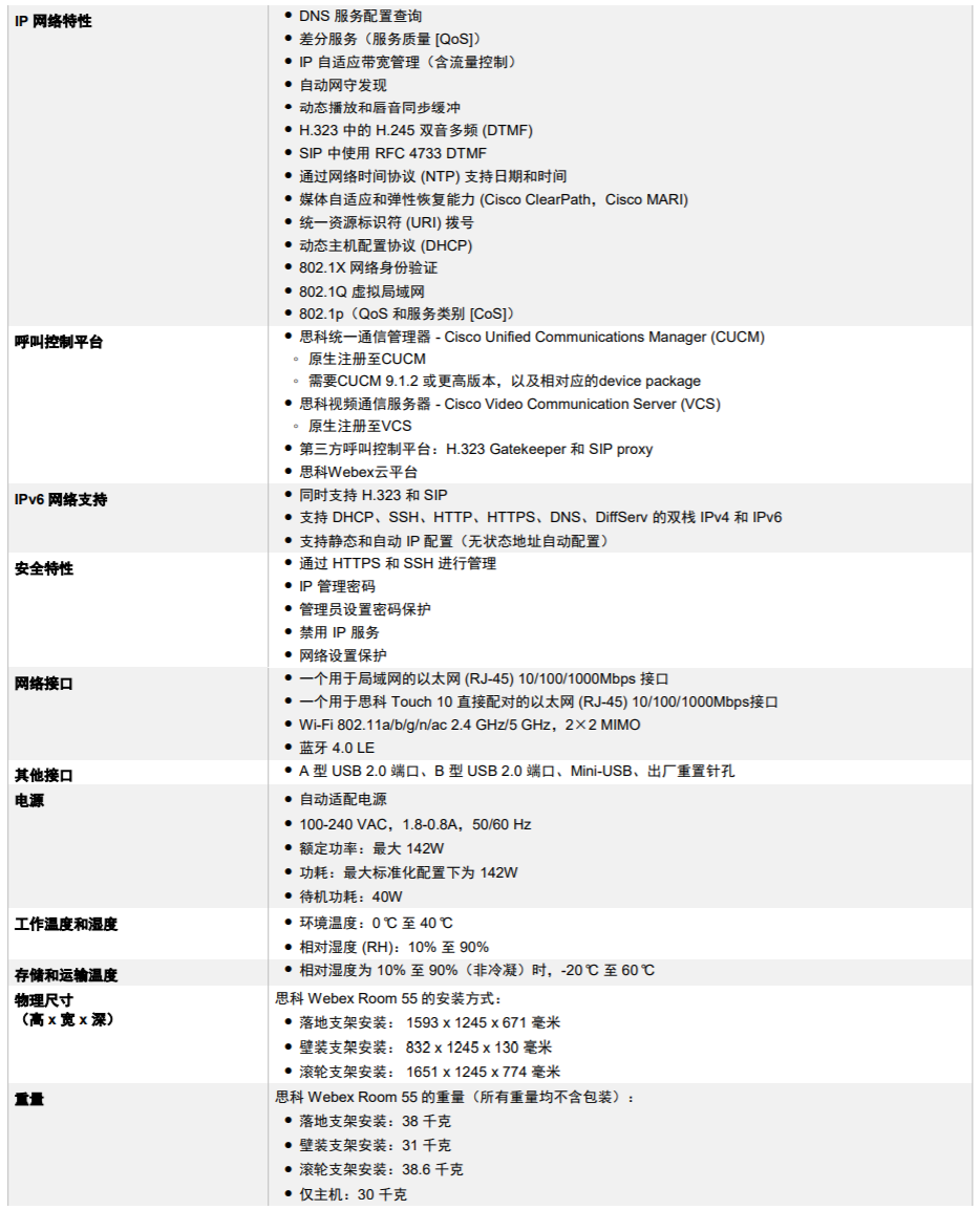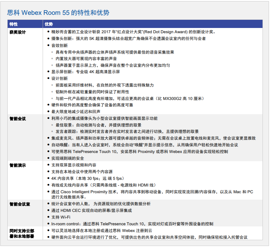 思科 Webex™ Room 55 是一款性能卓越的团队协作系统,它不仅提供无与伦比的视频和音频体验,而且在设计上亦精雕细琢,斩获了“红点设计大奖”(Red Dot Design Award)。它将摄像头、编解码
