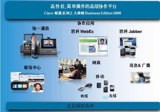 首先,思科BE6000H 型号的平台支持八种协作应用,最多可容纳 1,000 名用户、2,500 台设备和 100 个联系中心坐席,可以满足各个阶段各个规模的中小企业的协作要求。简化了企业与企业之间的沟通过程,实现随时随地办公,从根本上提高用户的工作效率,真正将移动化、可视化、社交化、客户服务等特性融为一体!。